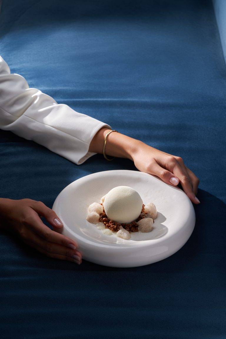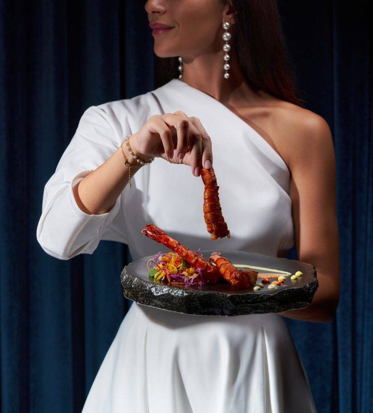As guests step into this gastronomic haven, they are greeted by a breathtaking ambience. Dark marble surfaces reflect soft, golden lights while rich blue velvet curtains drape gracefully from ceiling to floor, framing intimate dining alcoves that overlook stunning views of the Burj Khalifa. Thoughtfully placed greenery bridges the indoor and outdoor spaces, creating a lush and inviting environment that strikes a harmonious balance between sophistication and liveliness, setting the stage for unforgettable dining experiences.