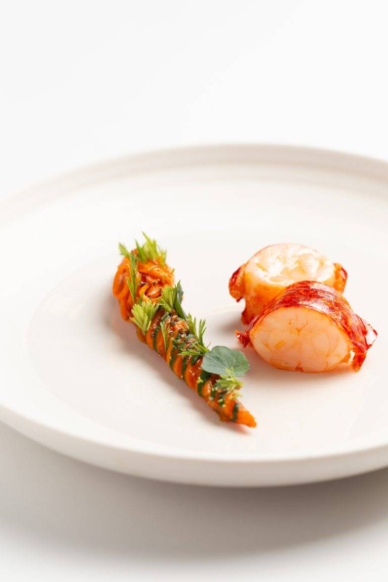 Blue lobster from Brittany flambéed with Douglas fir and rosemary served with coral beurre blanc, glazed carrots, pine buds and nasturtium coulis © Groupe PIC