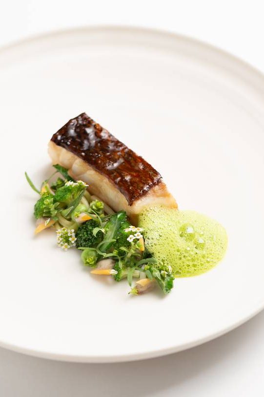 Mediterranean Denti barbecued and glazed with pastis, herbal dashi, kaffir lime and marigold, served with shellfish and broccoletti variations © Groupe PIC
