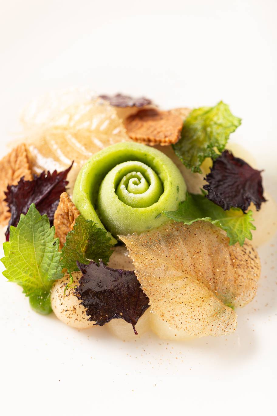Conference Pear with forest cep caramel, shiso sorbet and crispy leaves © Groupe PIC