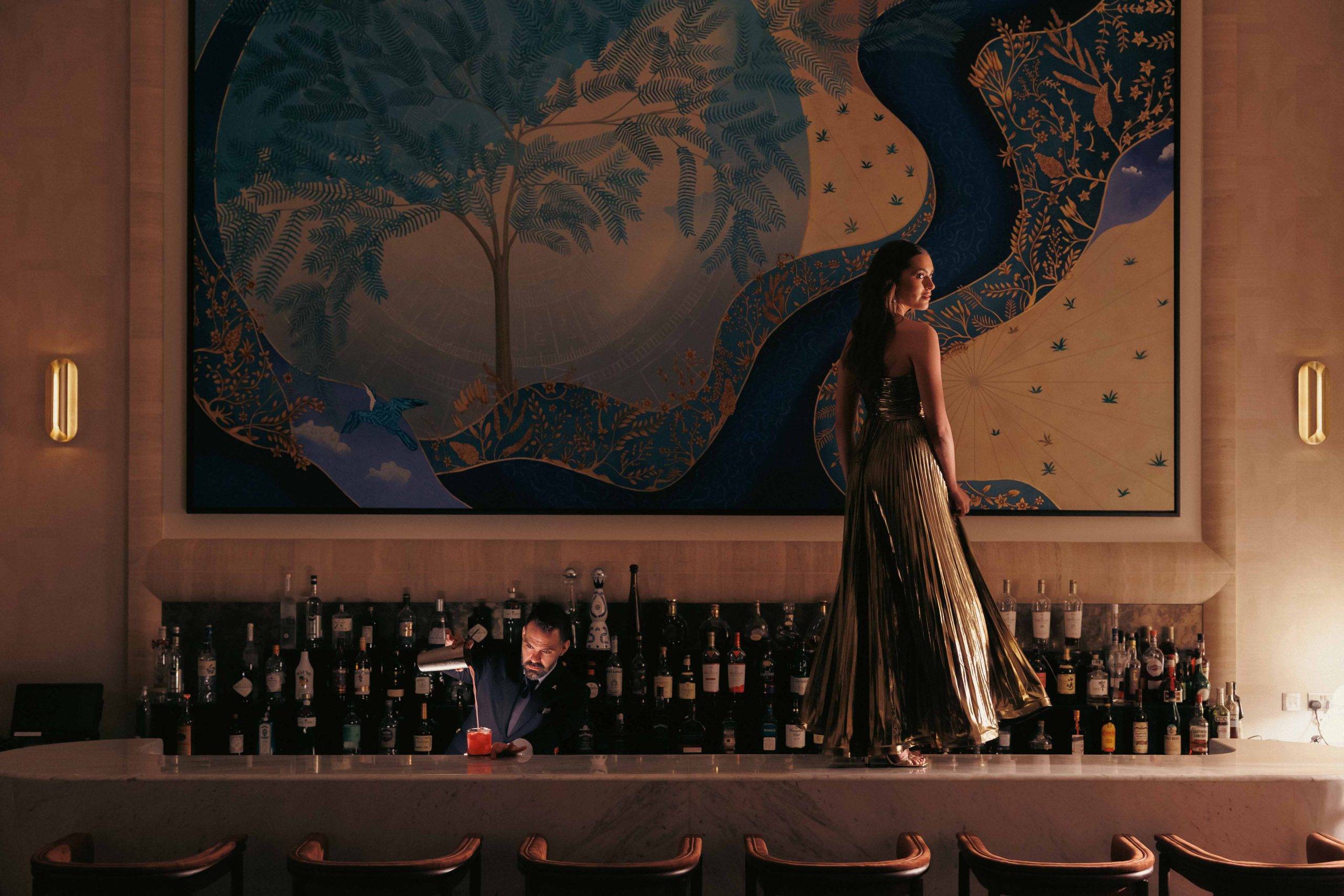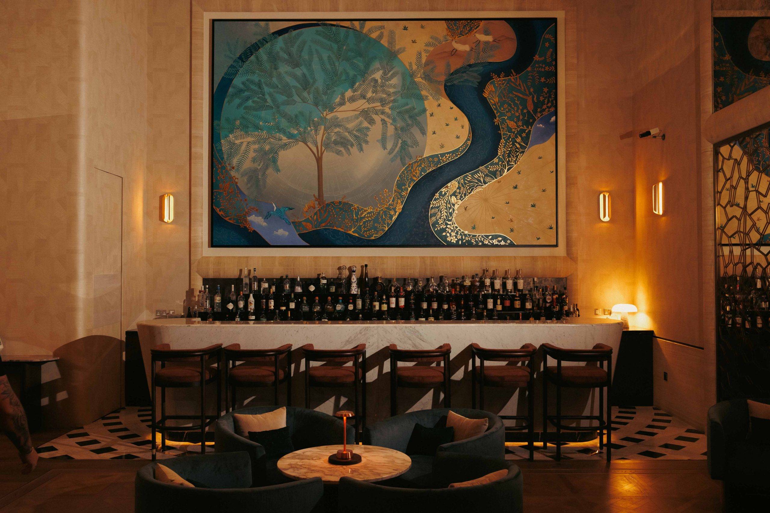The focal point of the revamped bar is a custom mural that pays tribute to the heritage and spirit of the UAE. Symbolic and layered, the artwork tells the story of Dubai through fragments of memory, nature and perpetual motion. Referencing the Al Duroor calendar—historically used to read the stars—the mural integrates emblematic motifs such as the Ghaf tree, the Arabian Oryx and a vibrant kingfisher in flight, each representing facets of local identity, landscape and resilience.