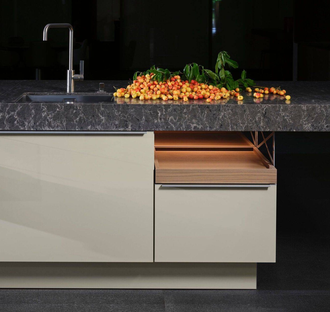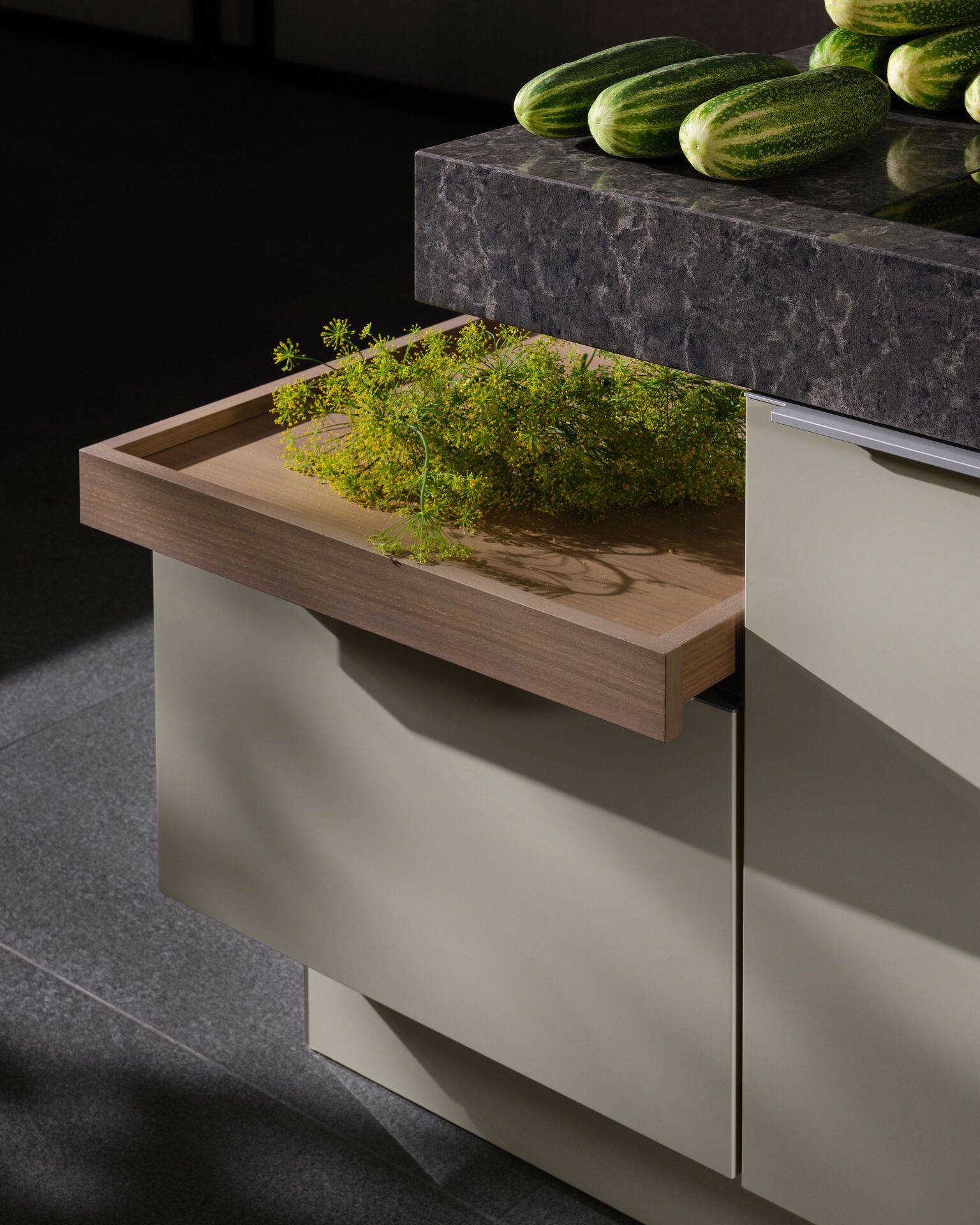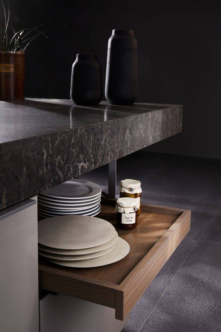 An intriguing detail of the +MODO concept is the discreetly integrated tray-like pull-outs on top of the base cabinets. These pull-outs can be effortlessly extended, offering easy access and convenient filling. To enhance both functionality and visual appeal, optional glass walls can be added, instantly transforming the trays into elegant display cases. Even kitchen utensils can be beautifully presented, elevating everyday items into stylish design elements.