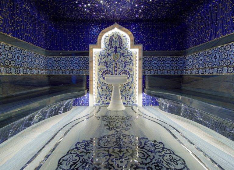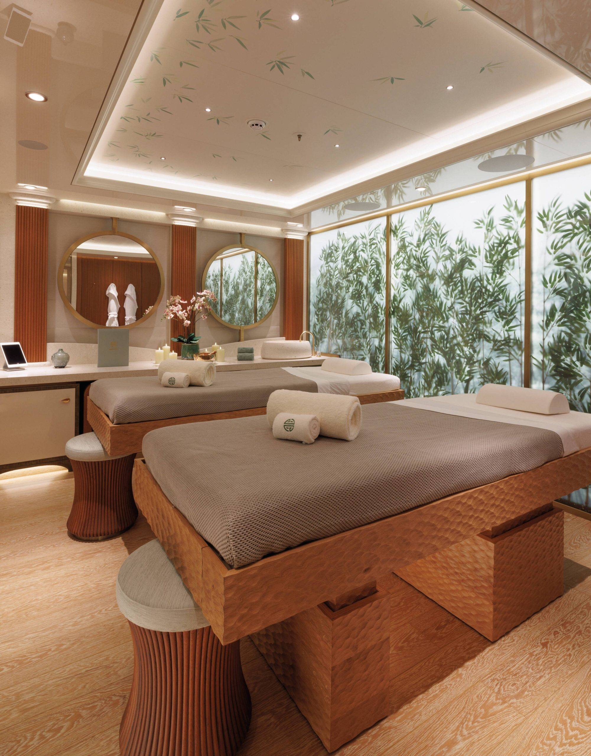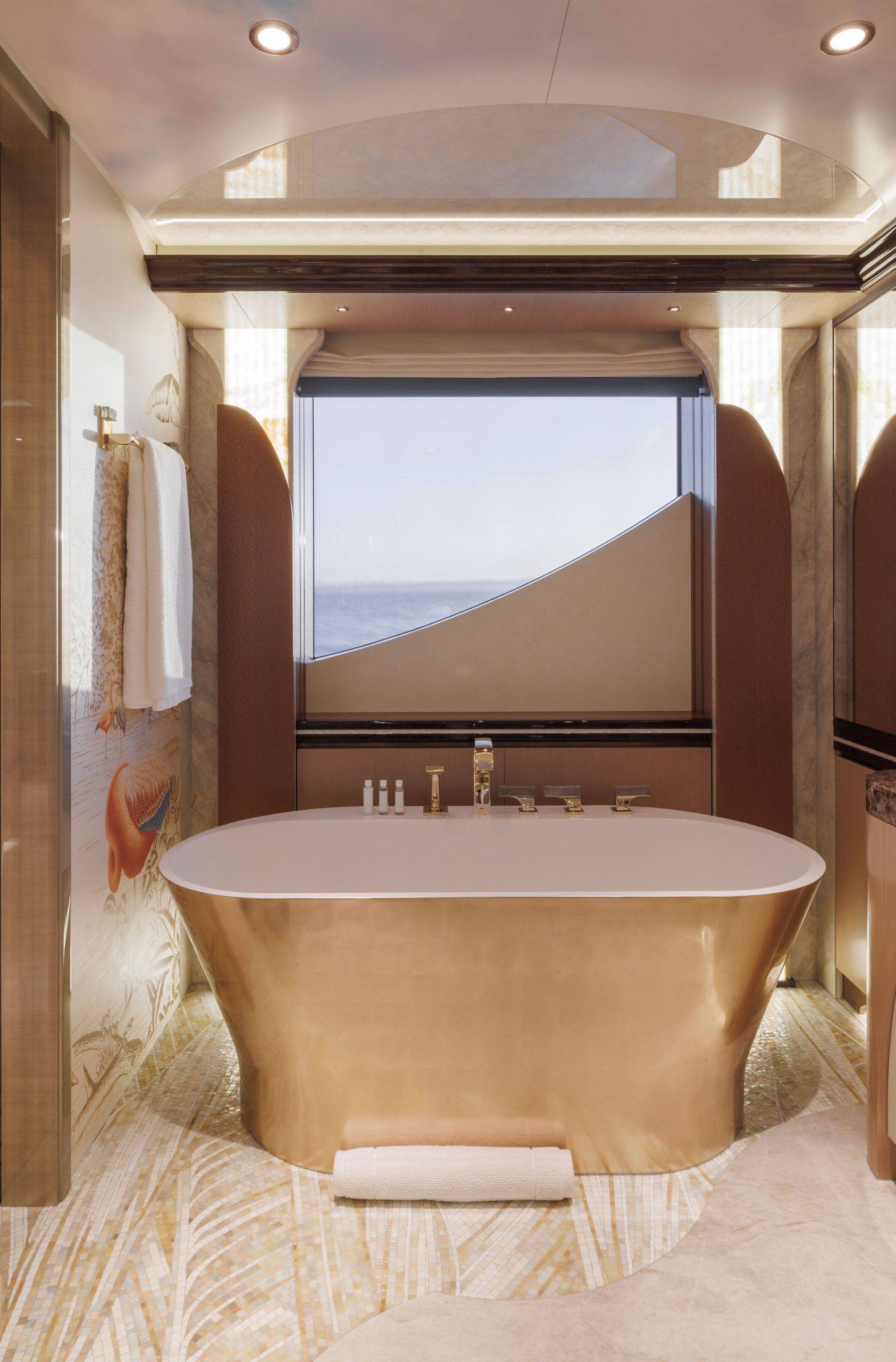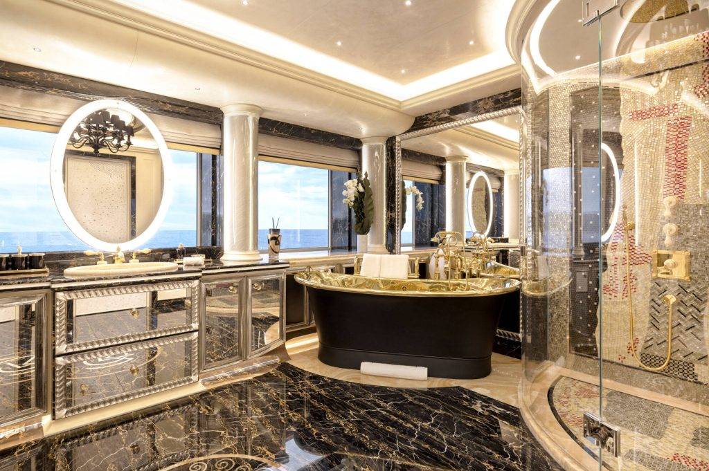 A dwelling fit for a king, the owner’s apartment spans a generous 245 square metres on the owner’s deck, plus an additional 95-square metre salon on the upper deck, seamlessly connected by a private staircase. The master cabin strikes an impeccable balance between spaciousness and intimacy, cocooning its occupants from the outside world. The adjoining exclusive-use deck space is equally discreet — a semicircular sofa and a coffee table overlook recessed balconies on either side, nestled into a tranquil corner and sheltered by glass bulwarks that frame the endless sea. Within the suite, his-and-hers bathrooms and dressing rooms are adorned with intricate mosaic motifs and audacious marbles, creating an oasis of opulence for its occupants. The male bathroom and dressing room captivates with an interplay of Honey Onyx and Black Portoro marble, embellished by an artistic mosaic wall in the shower inspired by Klimt’s paintings. In contrast, the feminine counterpart presents a symphony of pink hues that reflect the room’s cherry tree theme, complete with picturesque blossoms and birds. Both sanctuaries house two splendid freestanding tubs and bespoke crystal chandeliers, all celebrating the timeless allure of Venetian glass from the famed Murano island, including furnishings decorated with ornate cast-glass frames.