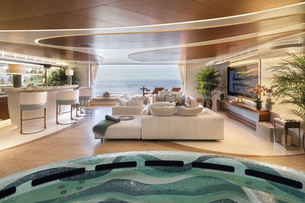 Venturing onto the owner’s deck, a distinct shift from the formality of the lower deck becomes evident. The charismatic salon boasts a contemporary and convivial ambience, where a dazzling interpretation of the universe graces the carpet, and an arresting lattice wood motif unfolds across the back wall. The aft deck flaunts a bespoke dining table with sixteen seats, a proud centrepiece within a winter garden that possesses the flexibility to embrace or shield from the elements, courtesy of its intricate system of sliding and folding glass doors.
