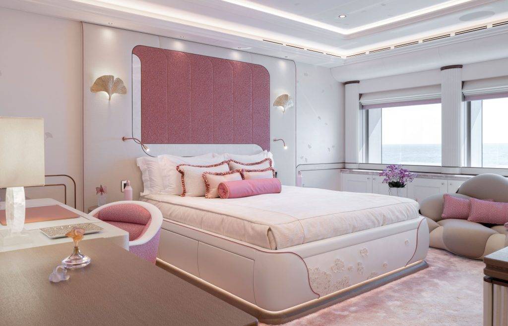 In addition to the master cabin, the vessel is home to a total of seven guest cabins. On the owner’s deck, a pair of family-designed cabins, each distinguished by its distinct colour scheme of pink and green, take inspiration from the graceful ginkgo leaves. These two suites also feature roll-top baths akin to those in the master bathroom. The rest of the guest quarters, all situated on the main deck, are furnished with a similar level of luxury and enjoy breathtaking views from the iconic semi-circle windows.