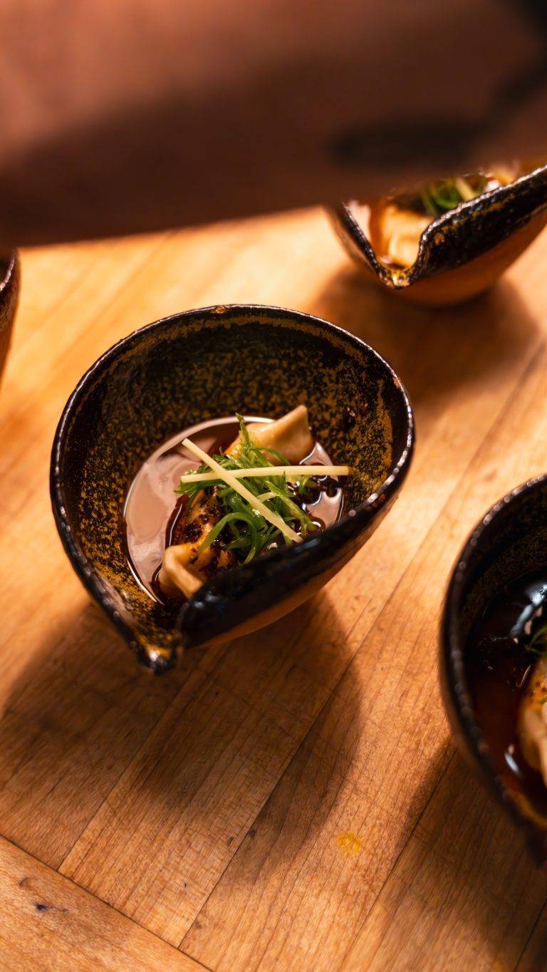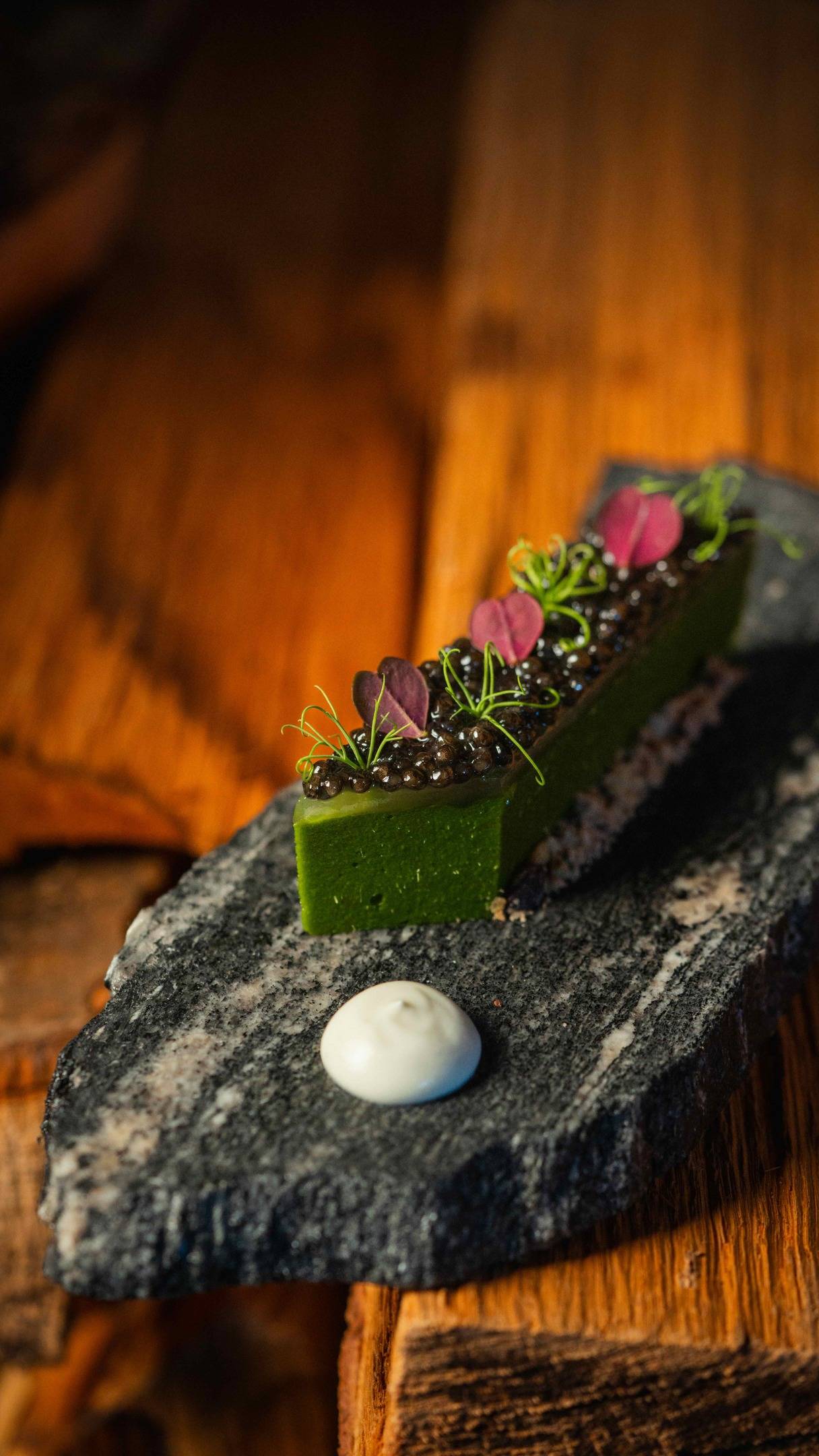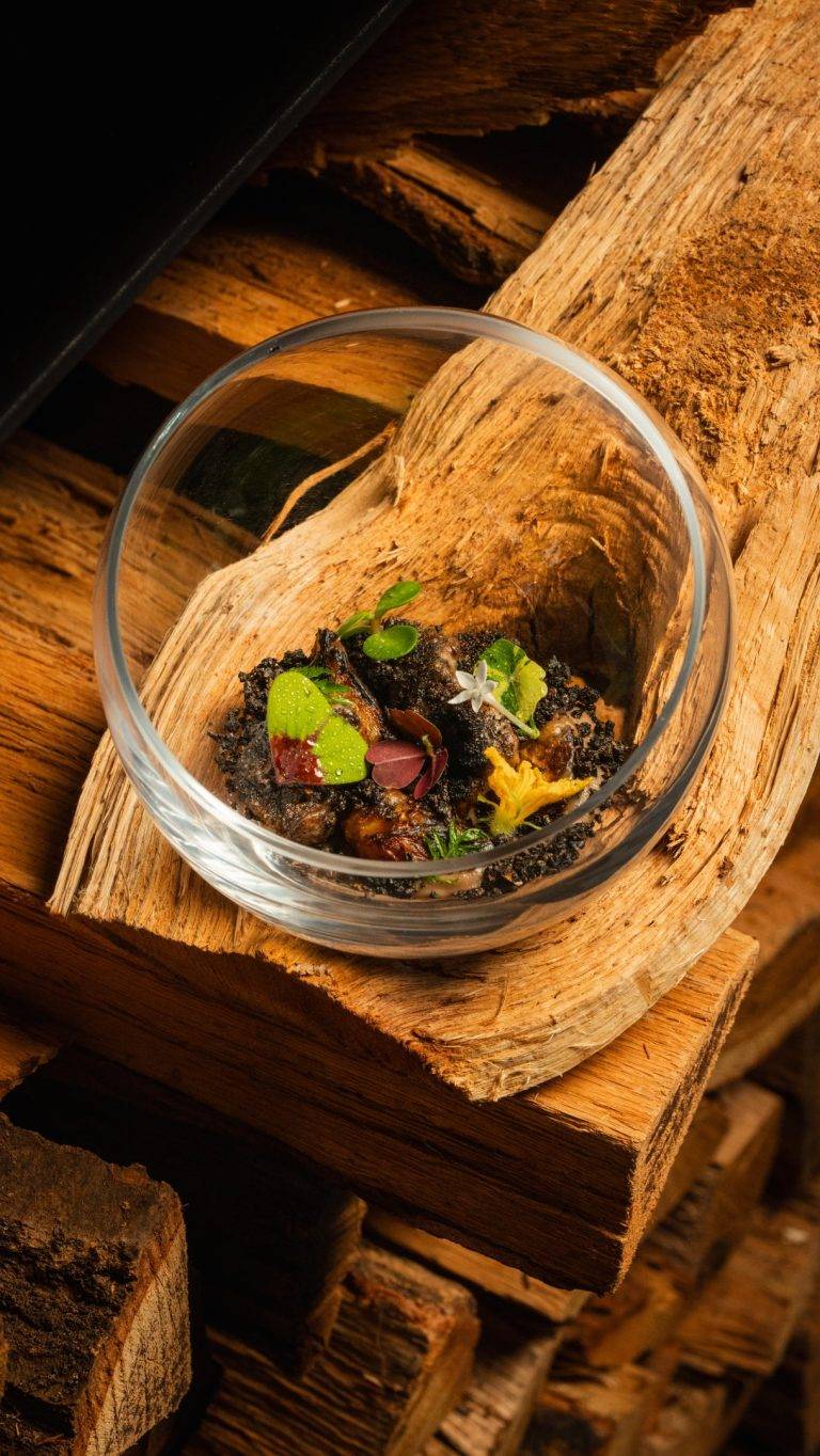 Guests gather around a polished concrete bar—naturally—encircling the open kitchen. The setting fosters an intimate exchange between chef and diner, each step of the process laid bare. Chef Gomez himself often steps forward to share not only the story of each dish but also his own journey: from working alongside some of the world’s most renowned chefs—including Daniel Humm of the three-Michelin-starred Eleven Madison Park in New York—to leading Brutø with his own vision.