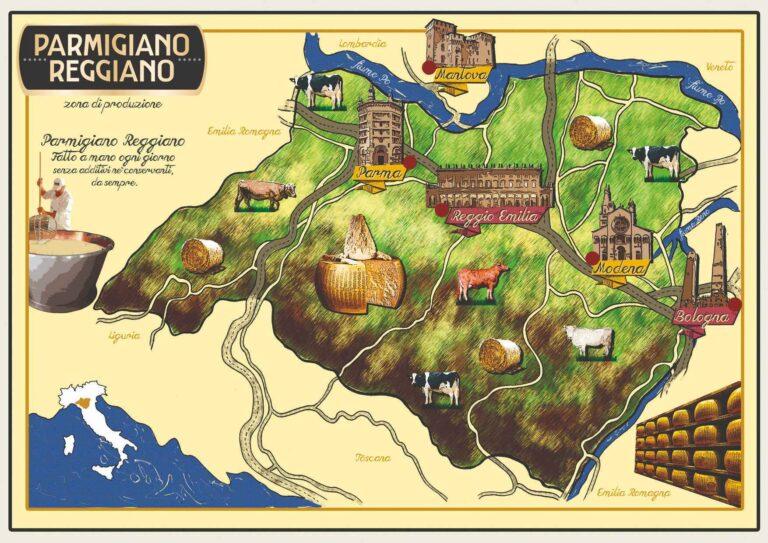 Authentic Parmigiano Reggiano can only be produced in Parma, Reggio Emilia, Modena, Mantua to the right of the Po river, and Bologna to the left of the Reno river.