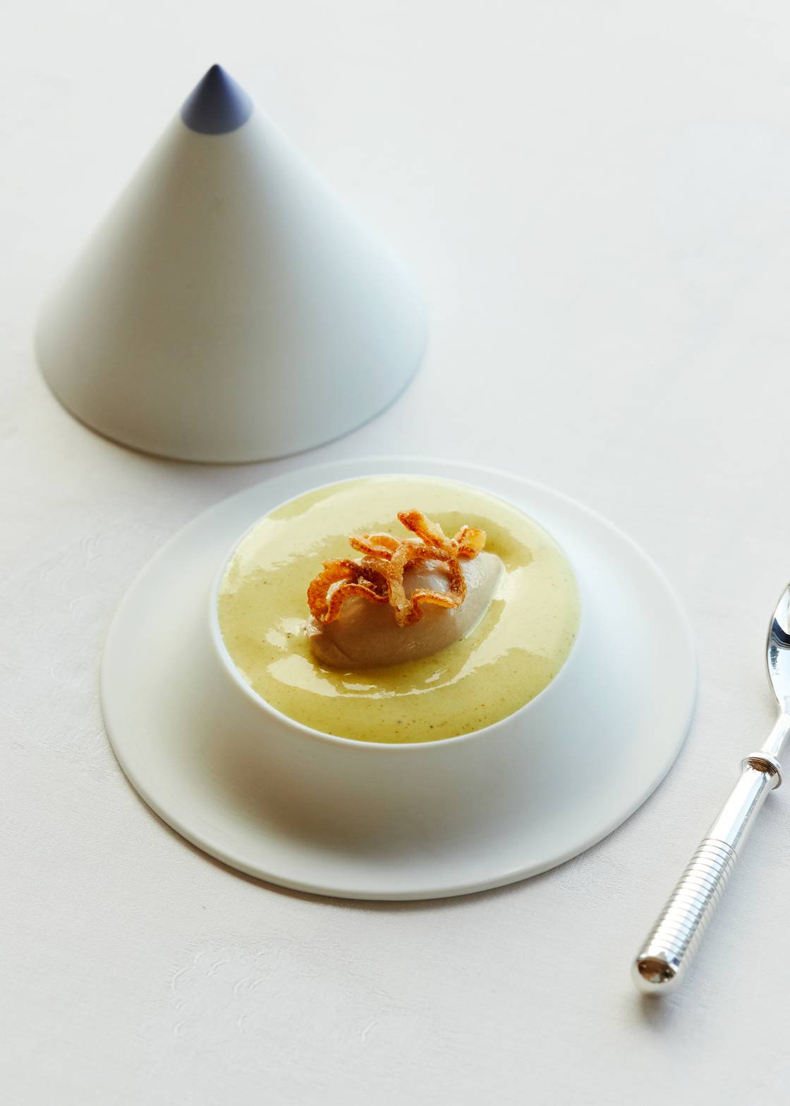 The gastronomic journey begins with a selection of appetisers. My favourite being the Coronation Chicken — chicken liver ice cream with fried baby onions in a coronation sauce. A homage to the royals, who are but a stone’s throw away from Brooklands by Claude Bosi.