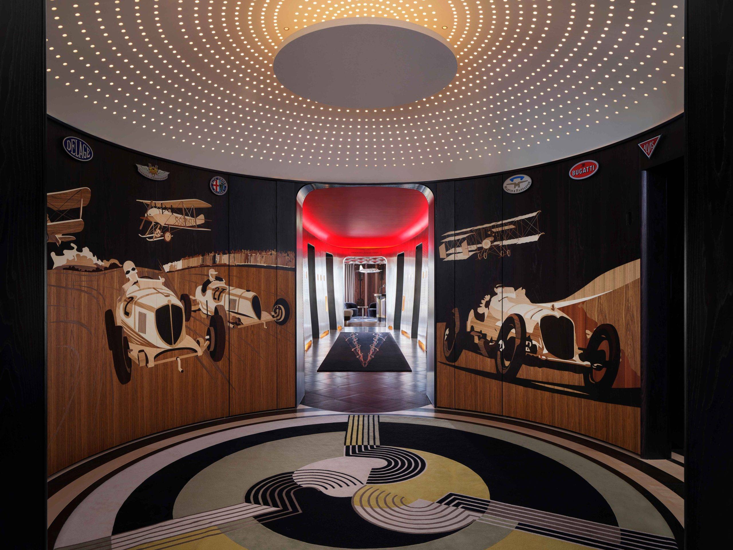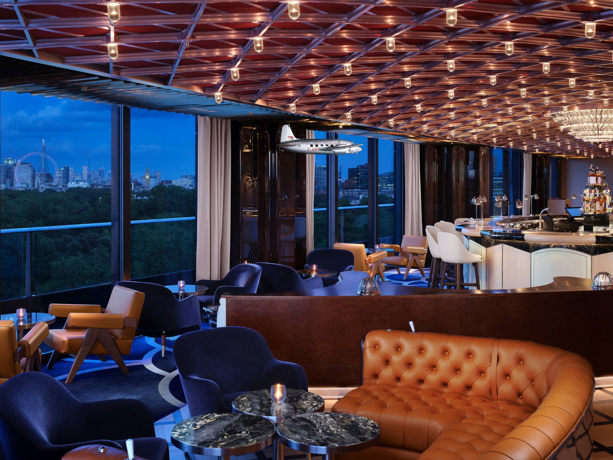 8 sets of floors up, you are greeted with never-ending views over Hyde Park and wider London, while the interior evokes the feel of being inside a museum dedicated to retro aviation and 1930s British car racing.