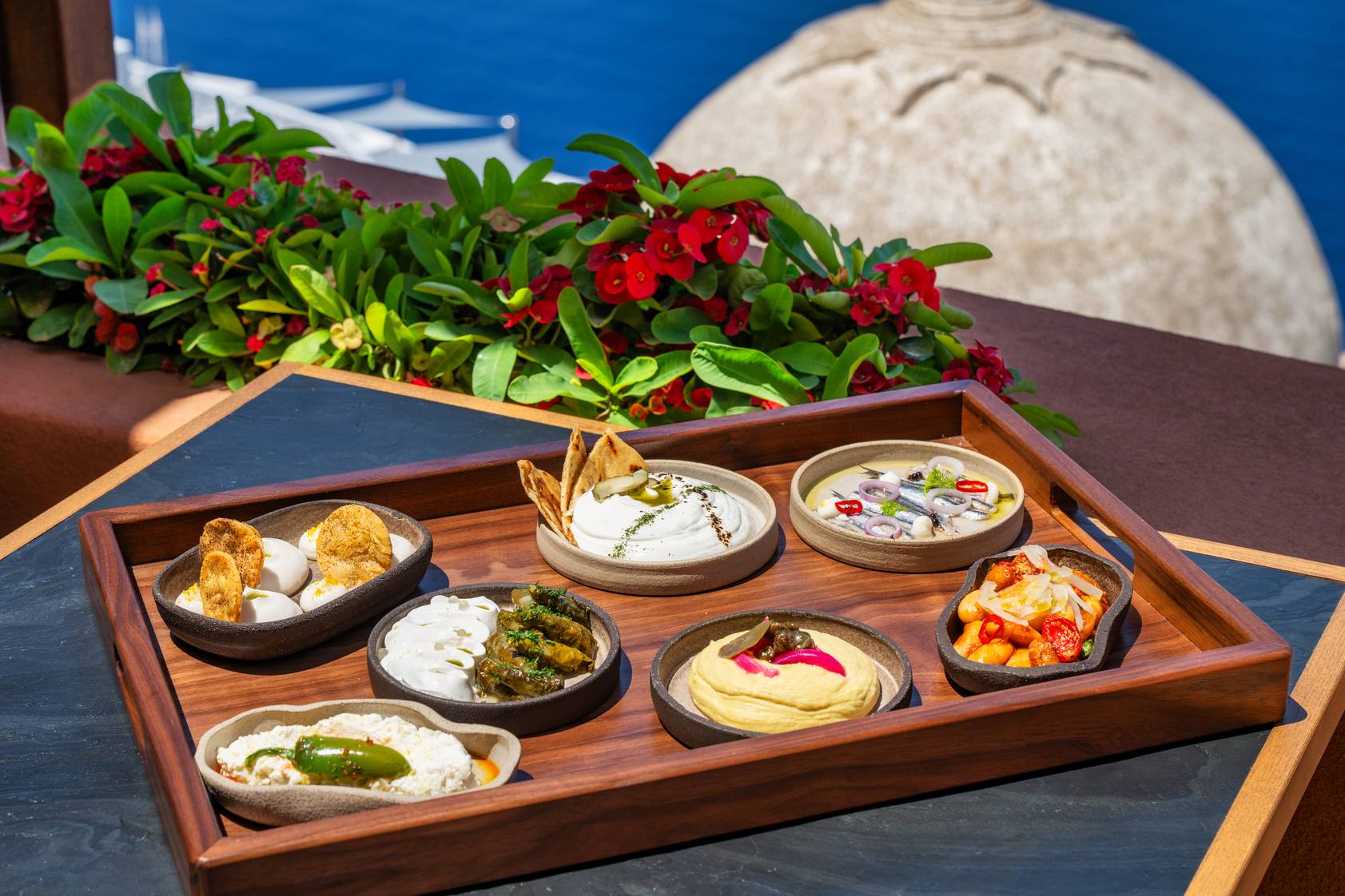 Makropoulos’ philosophy celebrates rustic flavours with a touch of sophistication: chickpeas slow-cooked in clay pots with orange zest and fennel, split-pea fava with caper chutney and pickled onions, and summer risotto gemista with pine nuts and feta mousse. From the land, goat shoulder “Mastelo” is slow-braised with lemon oil and grapevine wood, evoking the warmth of a family table. Meanwhile, Pastitsada, a reimagined beef ragout cannelloni with béchamel and tomato jus, captures the heart of Greek comfort food, elevated through refined technique. The sea, too, finds its voice—cured bonito with green chilli and cauliflower, and ceviche kissed with lemon ginger—each dish combining colour, freshness, and purity of flavour.
