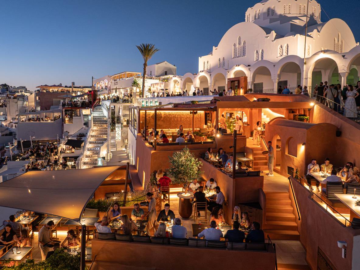 The ambience complements the cuisine: a sanctuary of Cycladic minimalism and island abundance, set against a panoramic backdrop of the volcano and the Aegean’s endless blue. Open until late, the taverna invites conviviality—where curated wines, signature cocktails, and artistic events create a vibrant meeting point for food lovers and socialites alike.