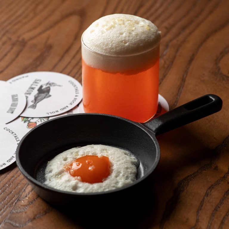 Among the signatures featured in the experience is The Mad Bunny, a cocktail disguised as a fried egg. It begins with a cube of cocktail mixture that is frozen and then transformed into a yolk-like sphere using an intricate poaching technique in water and a setting solution. The sphere is placed on a fluffy coconut mousse “egg white” and topped with popping candy, resulting in a single spoonful that delivers an unexpected explosion of flavour and texture.