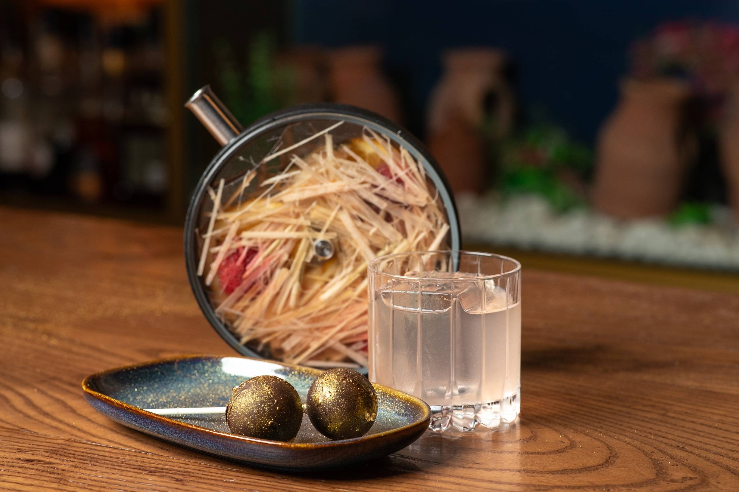Ultramarino introduces a creative take on cocktail “caviar.” Through precision spherification, droplets of cocktail are turned into gel-like pearls with a liquid centre, cradled inside a crisp cheese shell. When bitten into, the creamy shell breaks apart to release pearls infused with gin, mezcal, sherry wine, and rhubarb cordial—a cocktail that has rested in a clay amphora submerged in seawater for 72 hours.