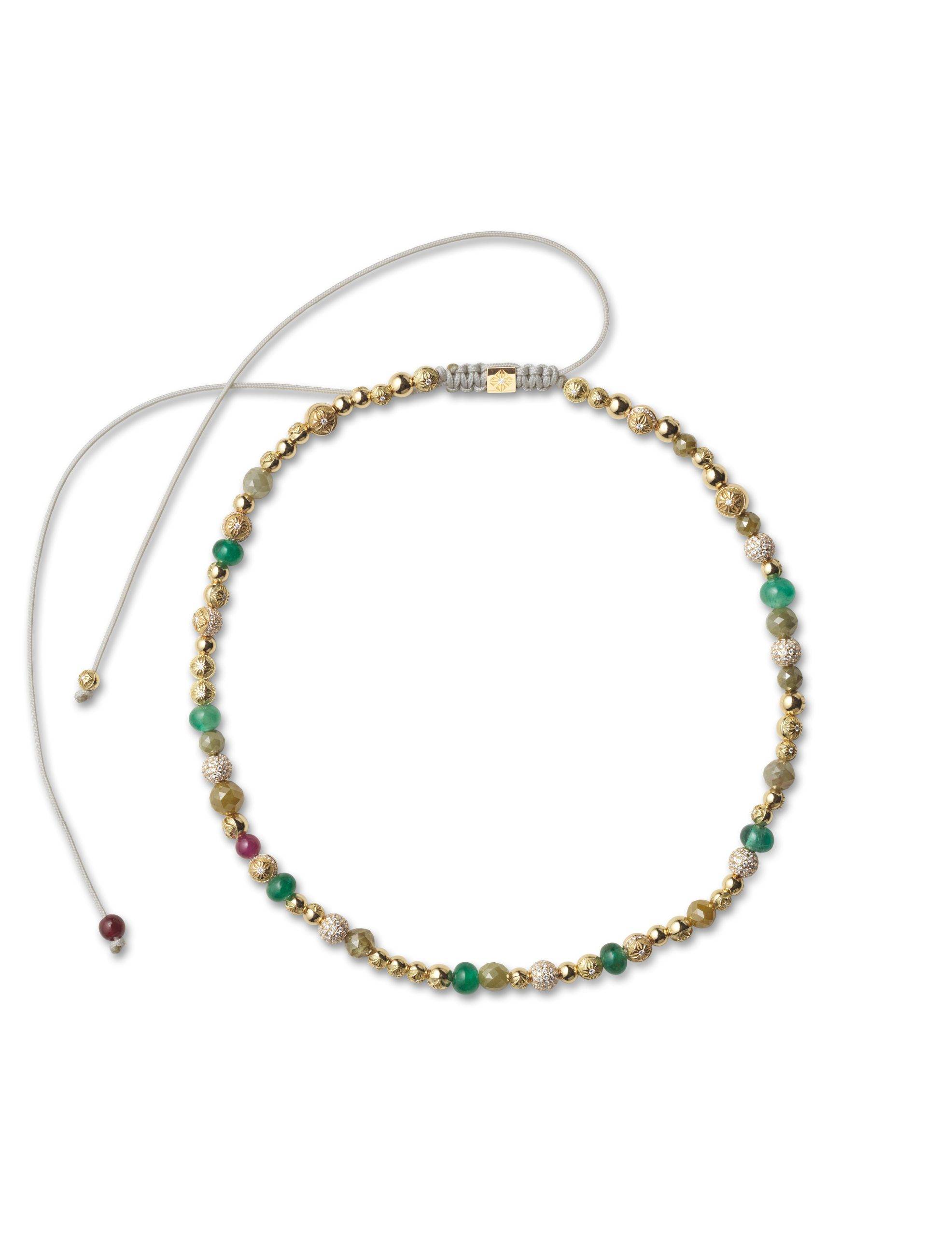 At its core, Shamballa Jewels’ philosophy centres around the idea that jewellery’s value transcends its gemstones and lies in the emotions it evokes and represents. The brand draws inspiration from ancient wisdom, using prayer beads as a symbol of spiritual connection. Each piece is meticulously handcrafted, featuring loose precious stones, diamonds, and semi-precious stones intricately woven together using a traditional macramé braiding technique.
