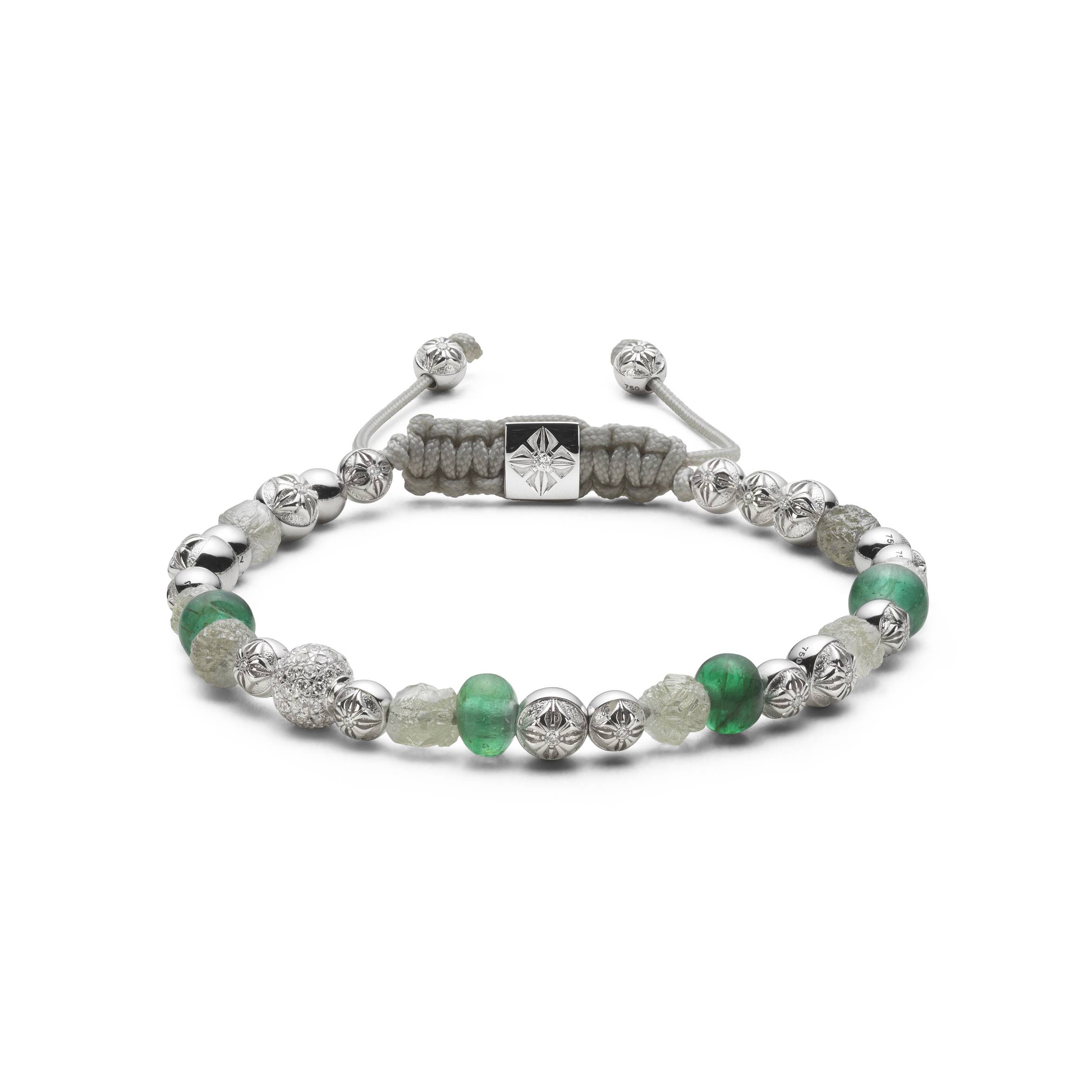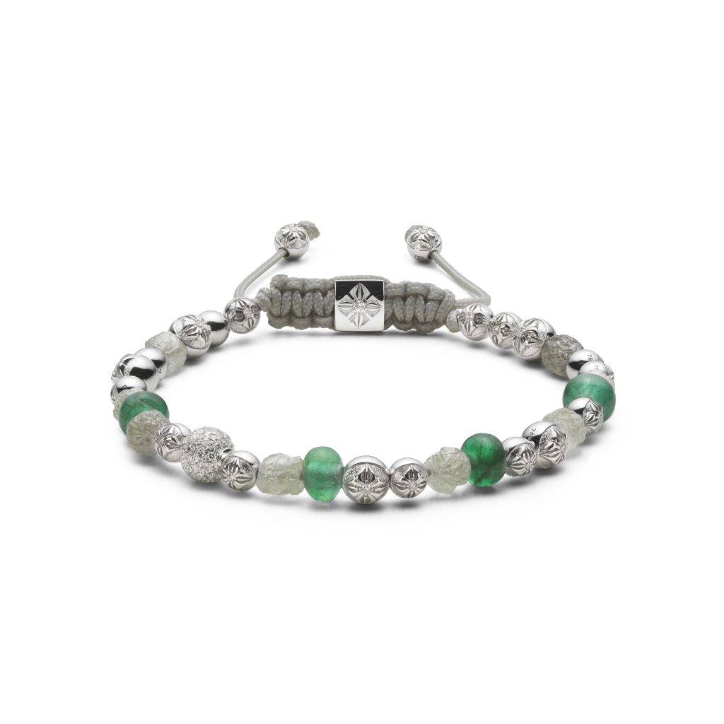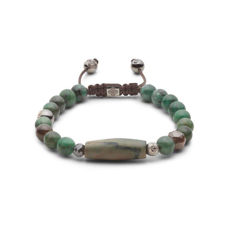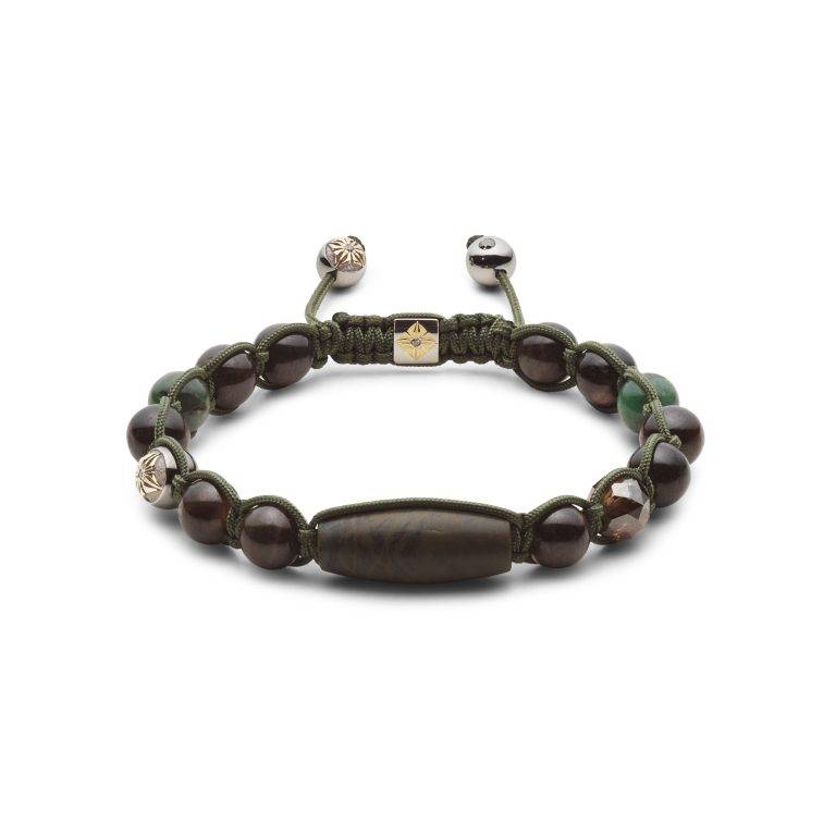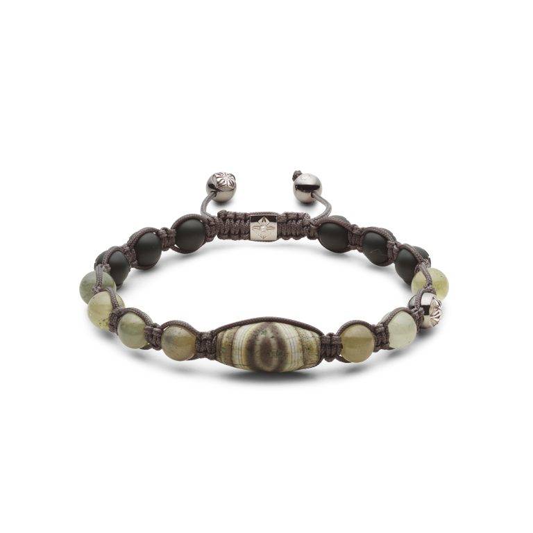 The Verdant Gaze SHAMBALLA® Bracelet (above left) spotlights a greenish cryptocrystalline barrel-shaped eye bead that has stood the test of over two millennia. This bead’s vibrant green tones infuse the age-old emblem with a sense of growth, renewal and vitality — attributes that lend themselves to modern interpretations of spiritual well-being.